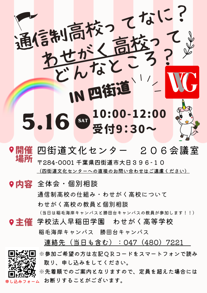 2026年5月16日(土)に四街道文化センターにて、わせがく高校出張説明会を実施します。