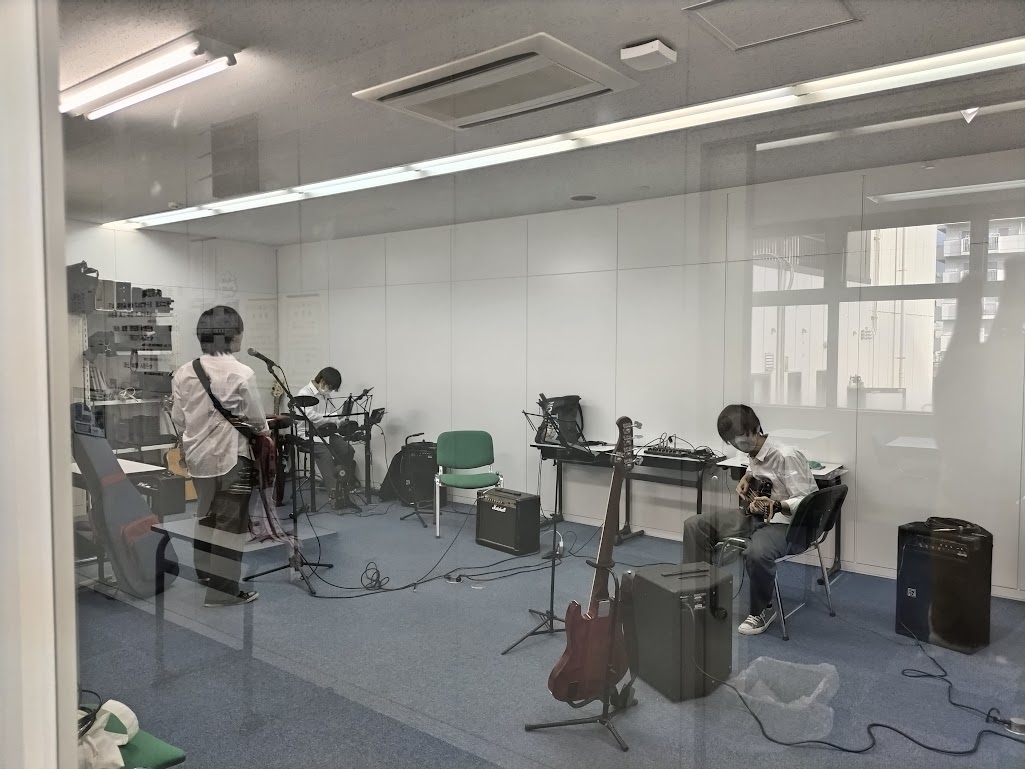 多目的室をのぞくと軽音楽部が続々と集まり練習をしていました。