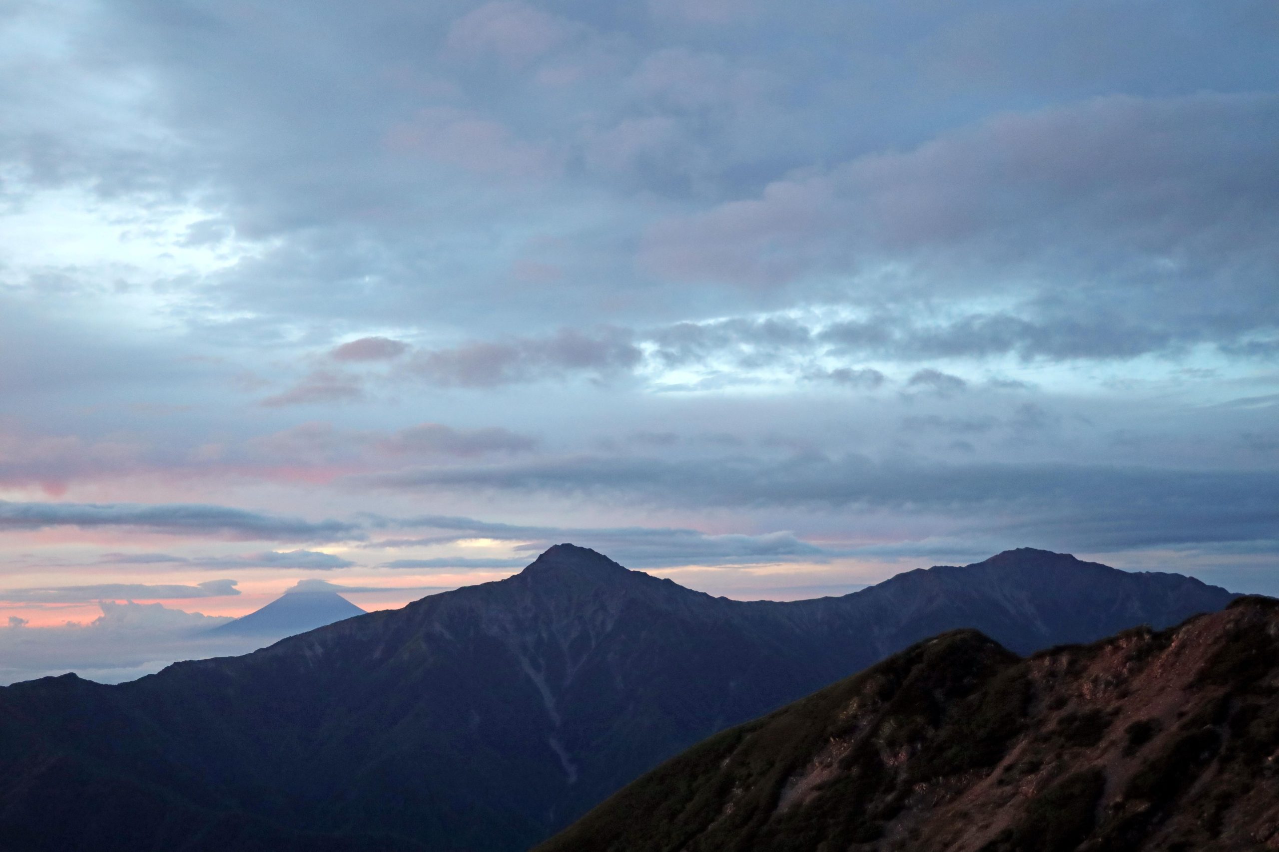 左奥に富士山(3776m)、真ん中に北岳(3193m)、右に間ノ岳(3190m)になります。