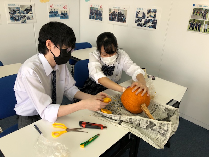 かぼちゃをくり抜いている生徒たち。