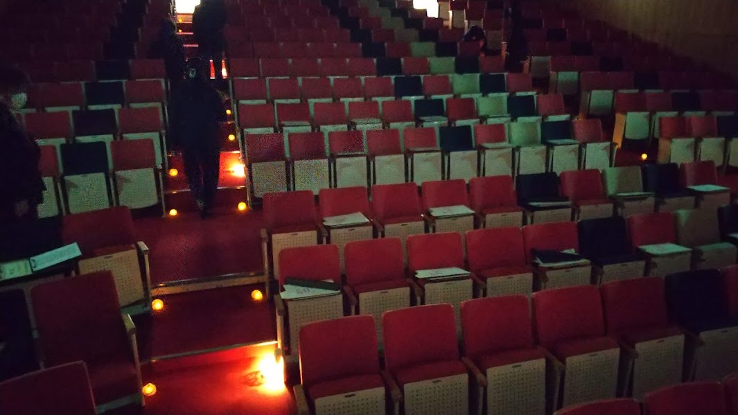 横看板の設置、ステージ上の配置、そして、照明・音響の調整。
