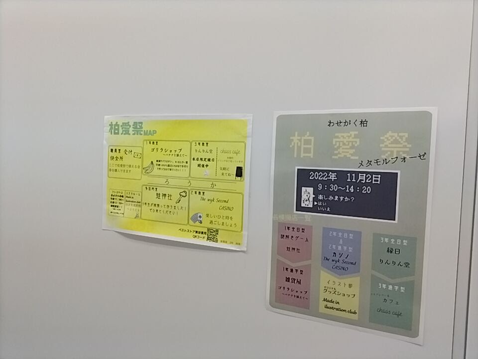 教室や廊下にいたるところに、柏愛祭のチラシが・・・。