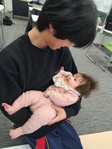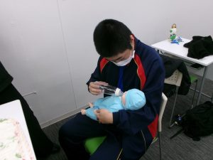 次に新生児人形を用いて抱っこやお着換え、オムツ替え等の練習。