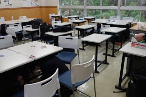避難訓練では、地震の発生後に火災が起きた場合を想定しました。放送が入ると、生徒たちは迷うことなく机の下へ身を寄せ、頭を守る姿勢をとりながら先生の指示を落ち着いて聞くことができました。