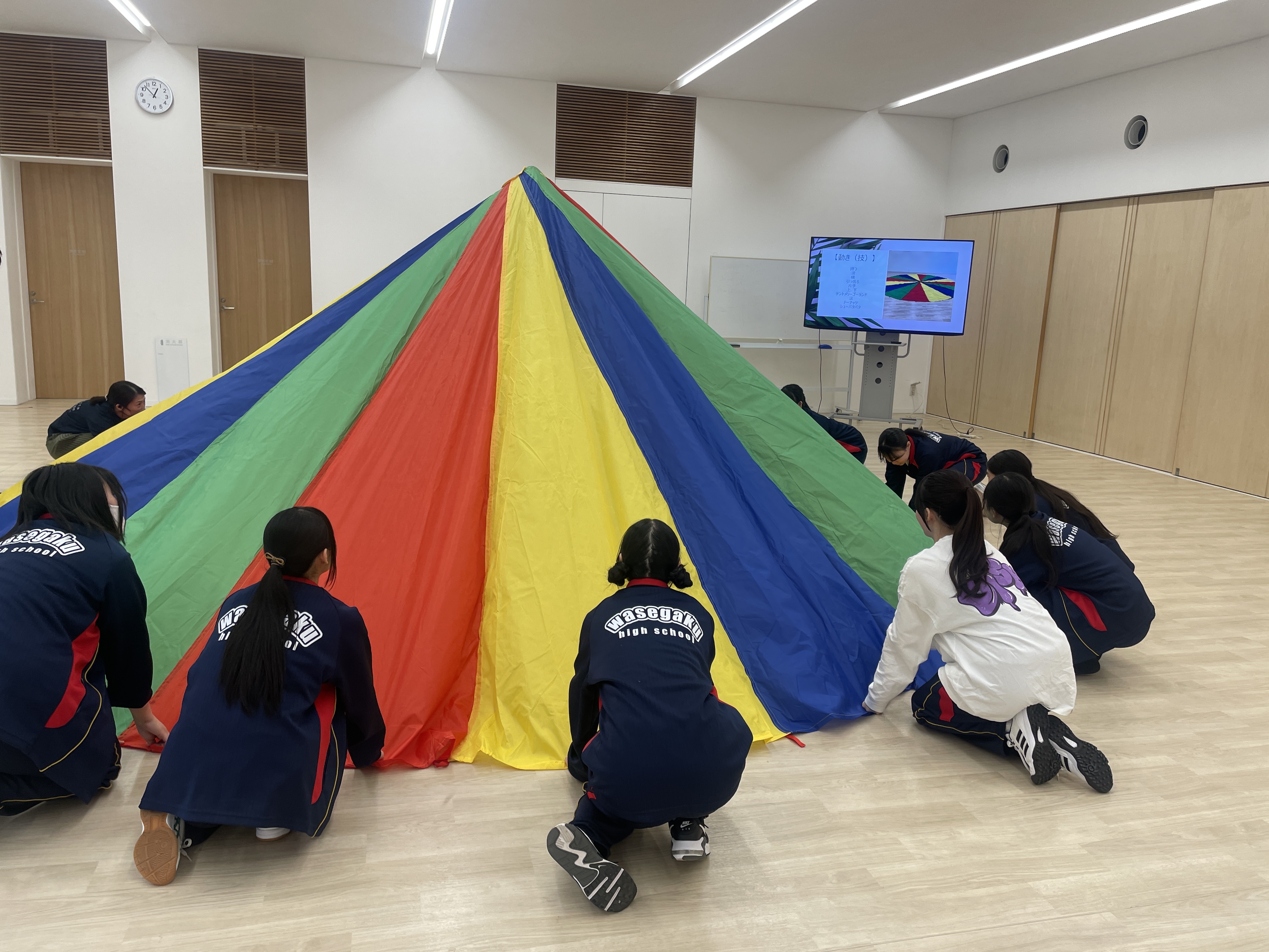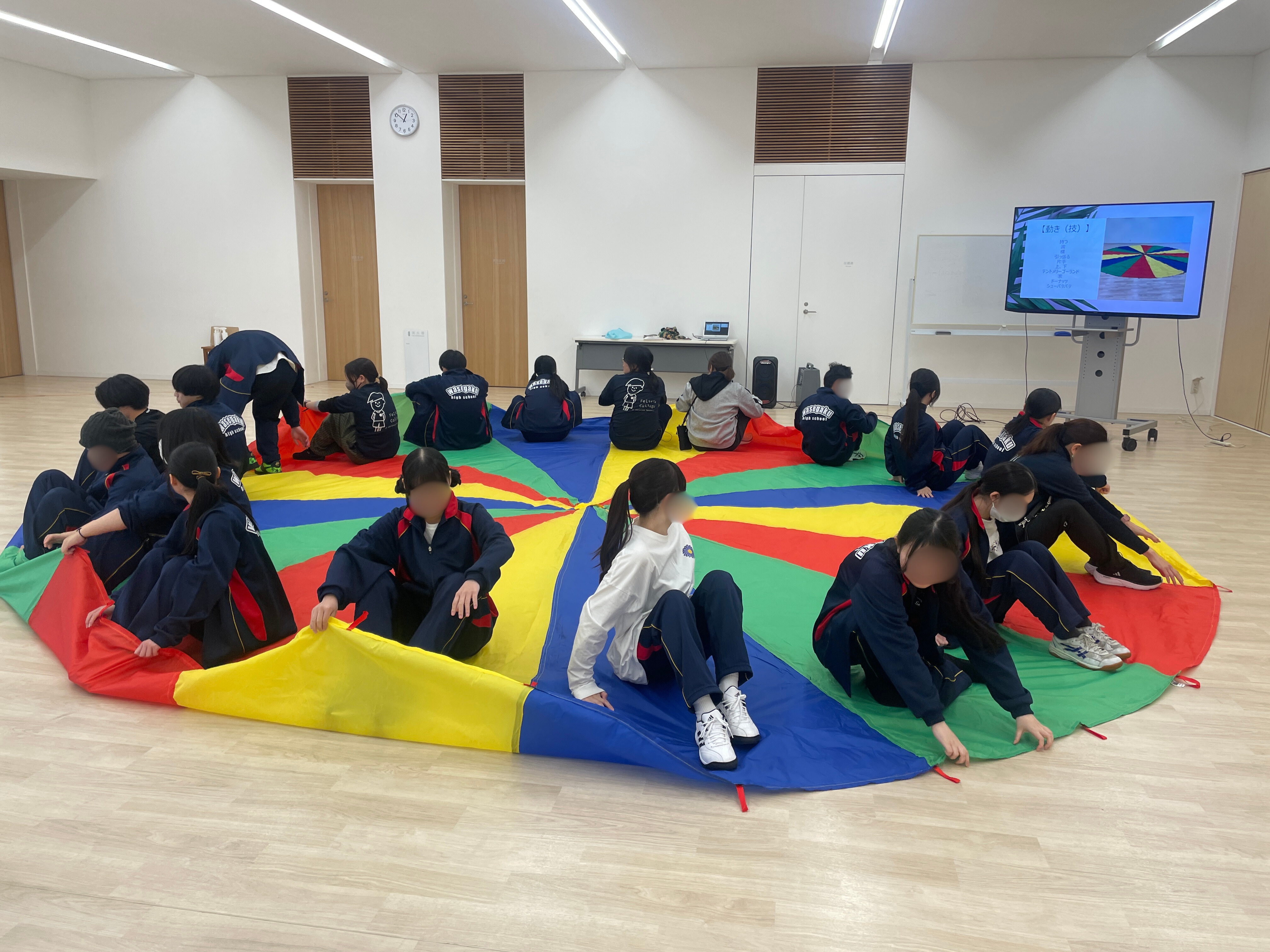 ご飯を食べ、体力が回復した後は、全員で協力して布を大きく動かすパラバルーンを体験しました。