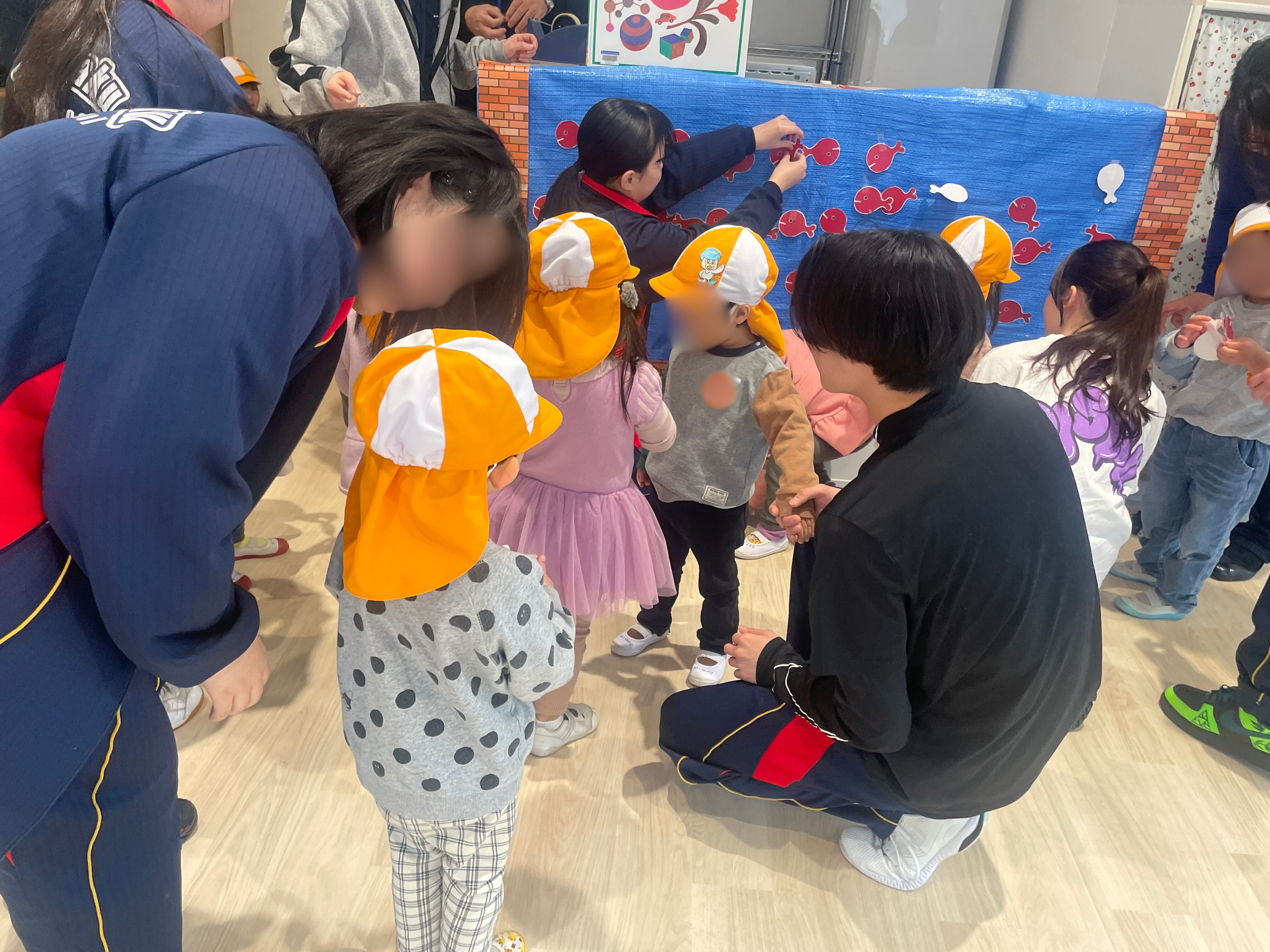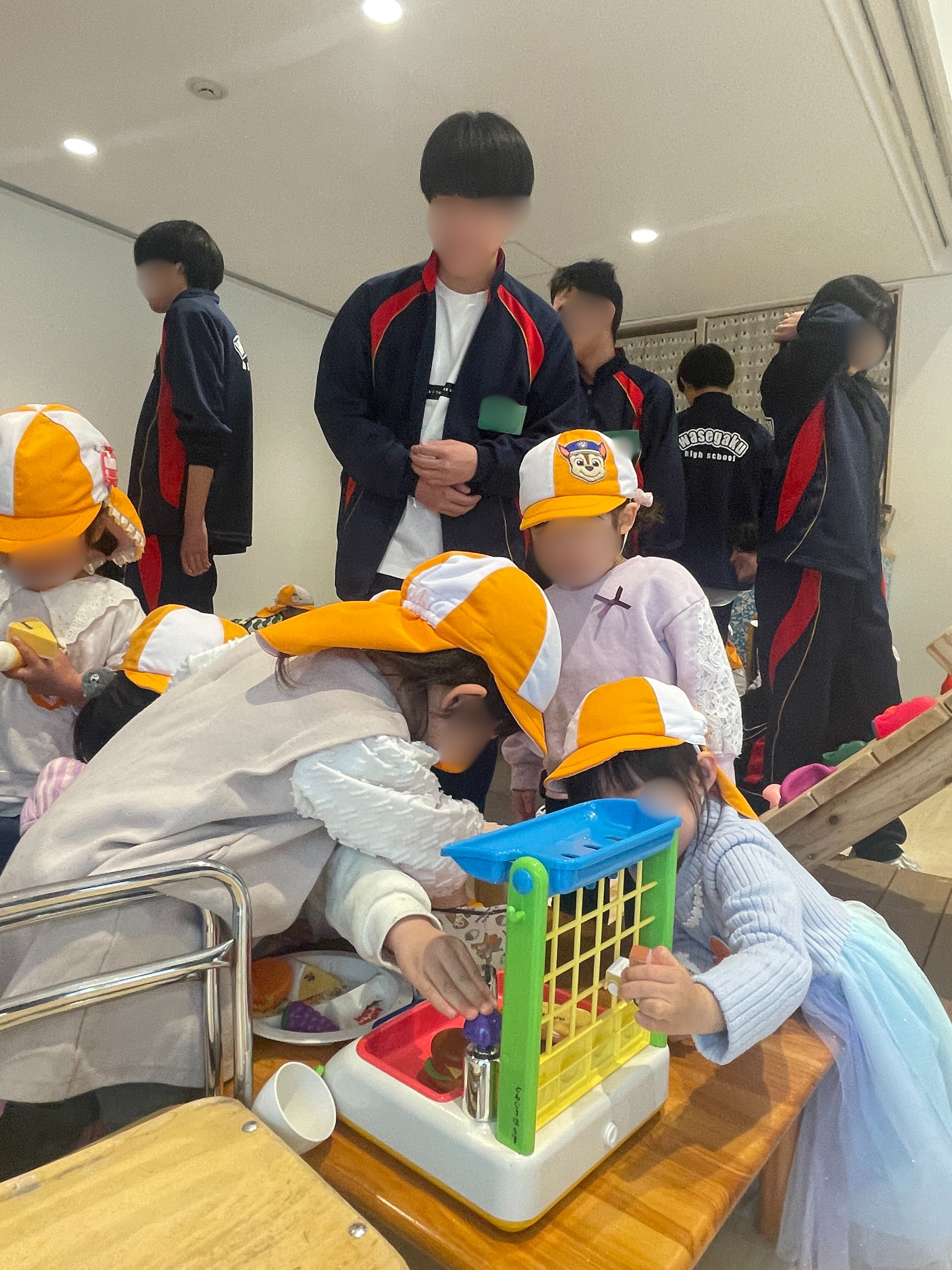 午前中は幼児とのふれあいの時間です。会話をする時はしゃがんで目線を合わせたり、遊びに夢中な幼児が怪我をしないように気遣う場面が見られました。