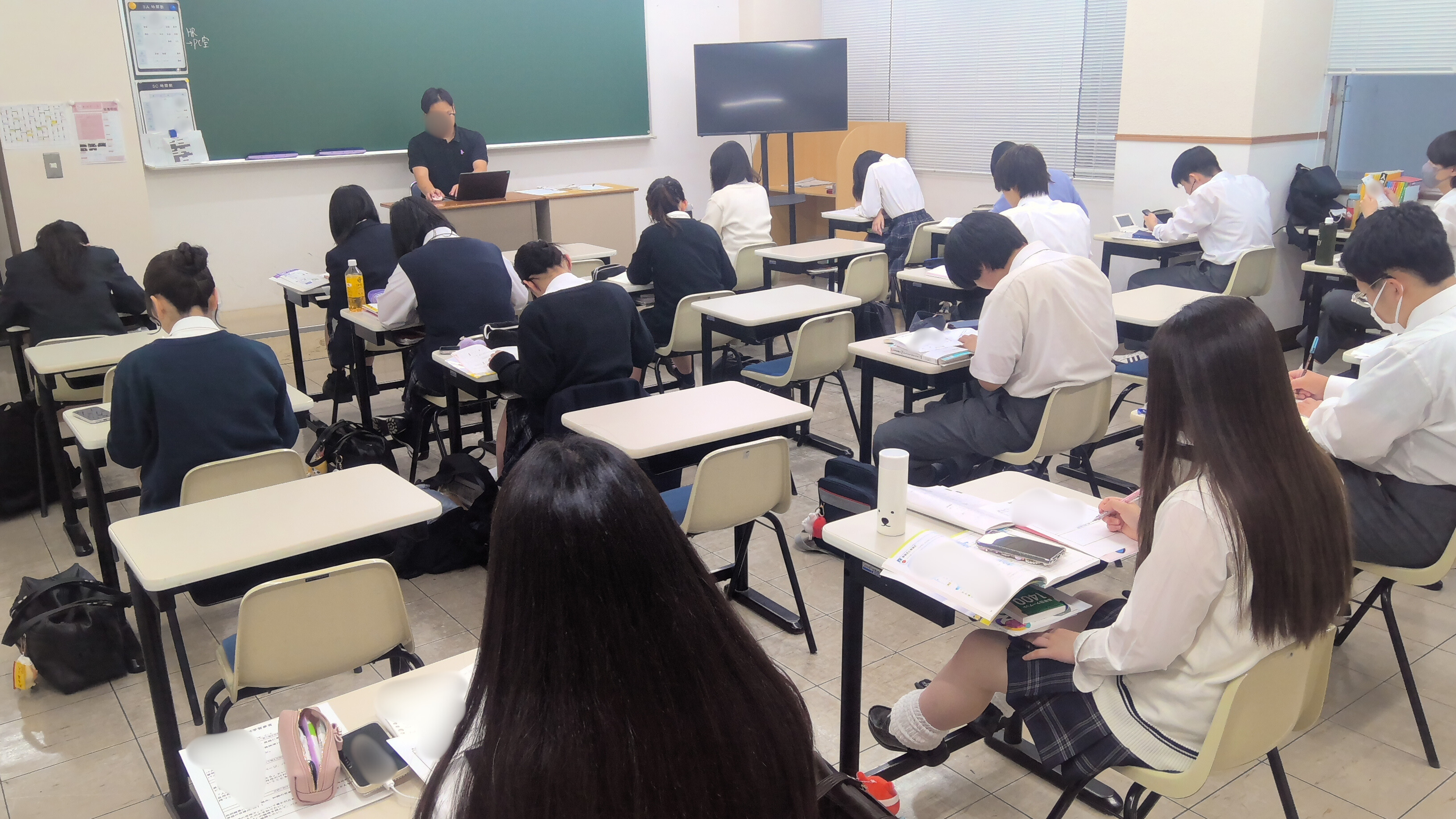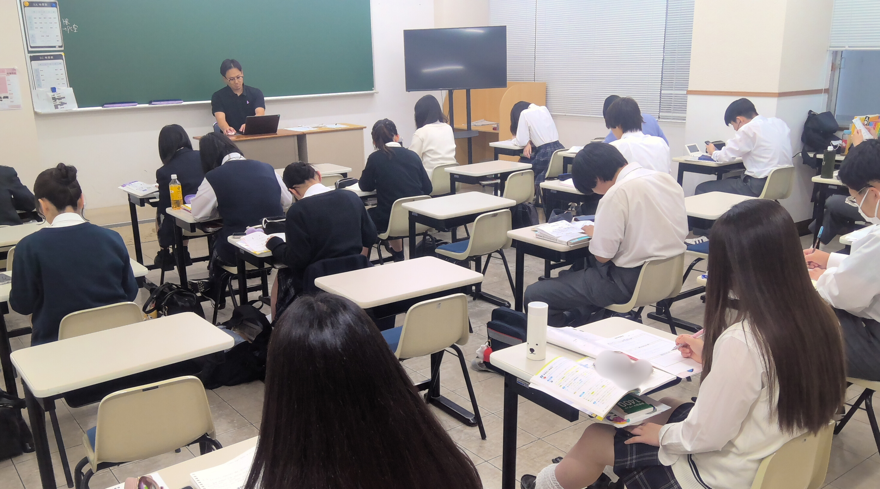 教室では、生徒たちが静かに机に向かい、問題集や教材と向き合いながら、集中して学習していました。