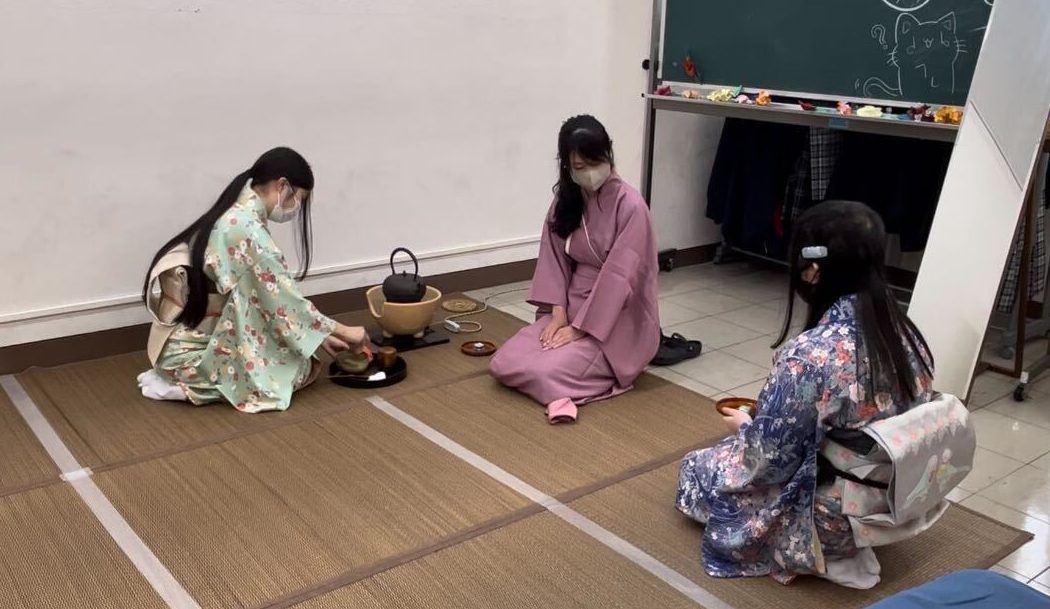 ご来校いただいた方にお茶をお出しし、日本のおもてなしを体験してもらうために練習中です。