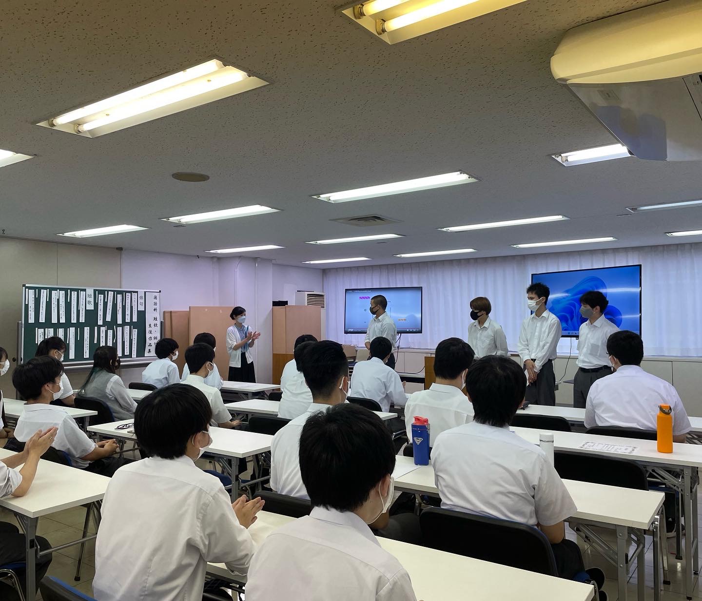 終講式では、夏季休業前までの振り返りとして、各種検定の表彰や皆勤賞、到達度テストの表彰などが行われました。また、各委員会からの取り組みの報告もありました。