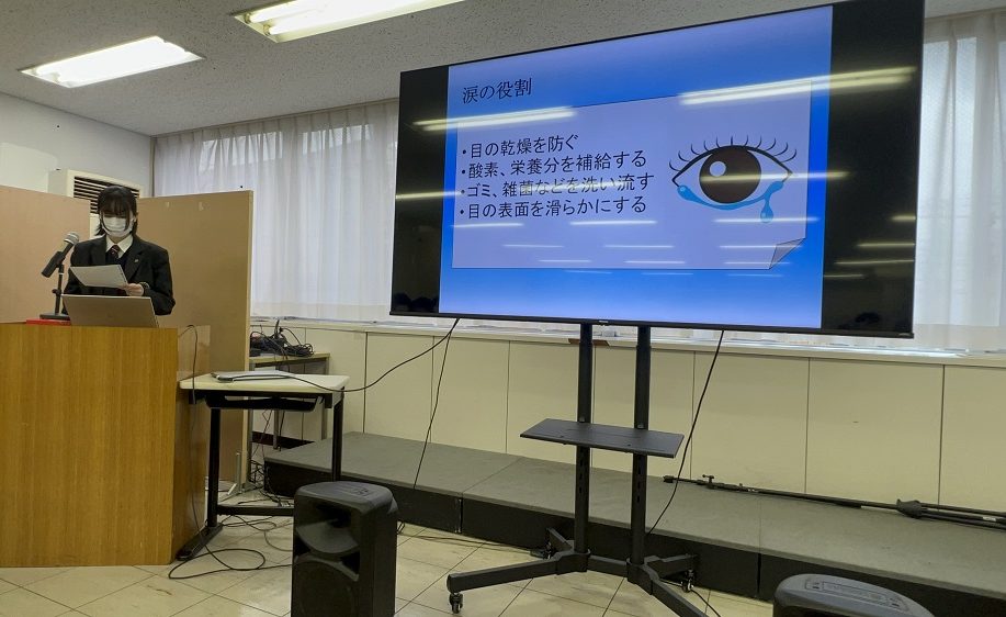 それぞれの探究の成果をスライドにまとめ、2・3年次全員と1年次の希望者が発表をしました。