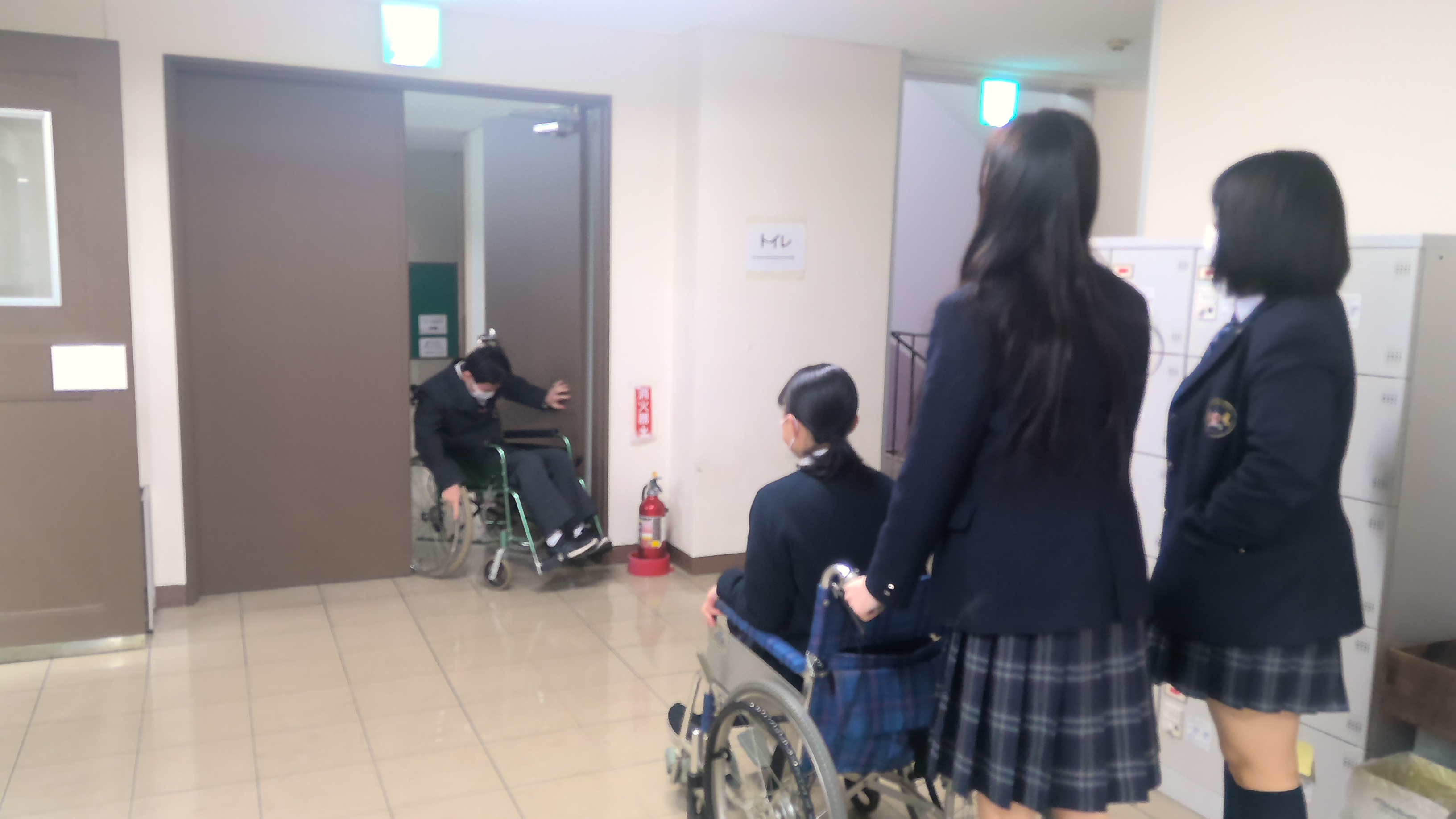 ↓講話の事前学習として、車いす体験を行い、介護する側とされる側の双方の視点から理解を深めていました。