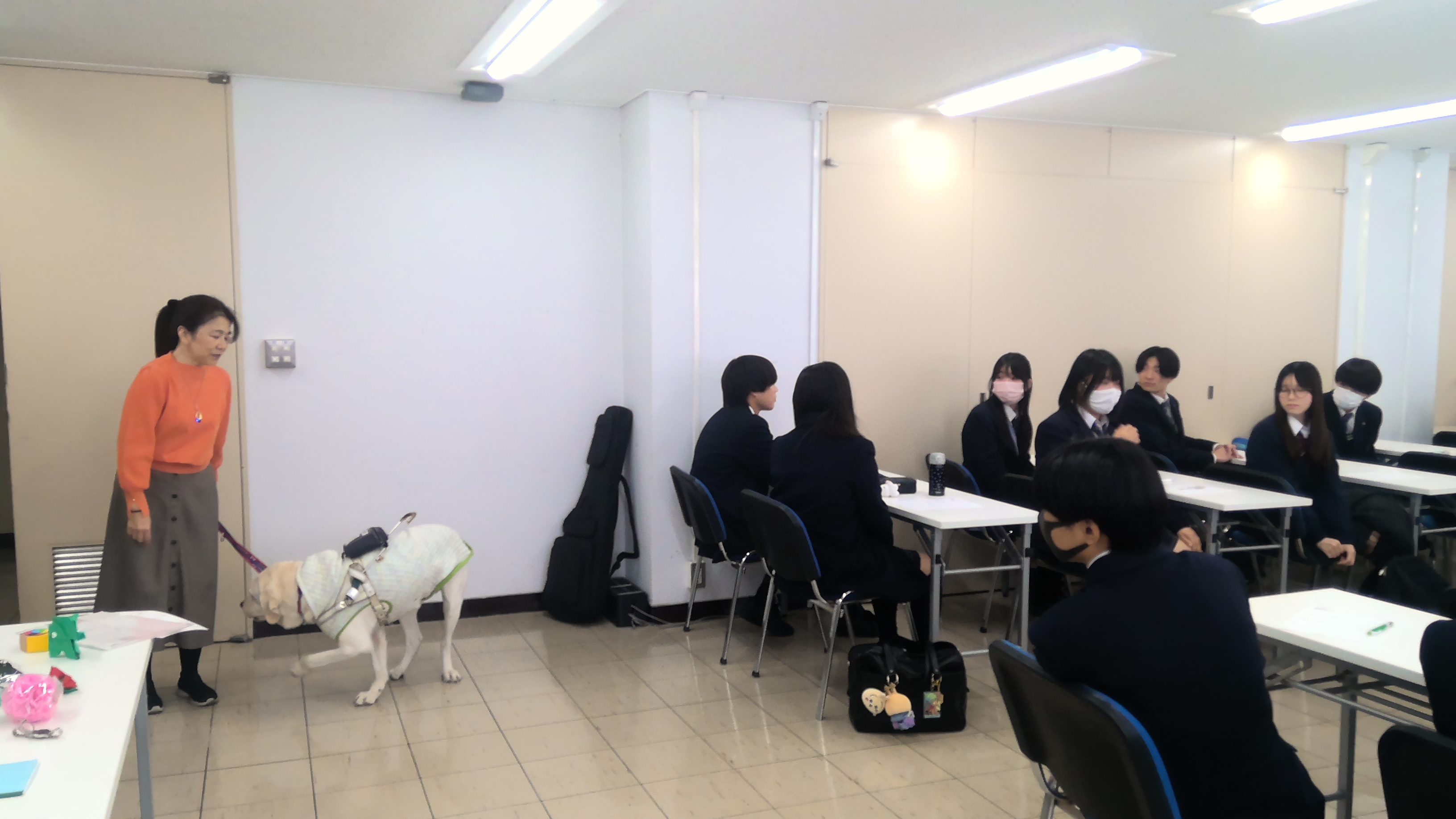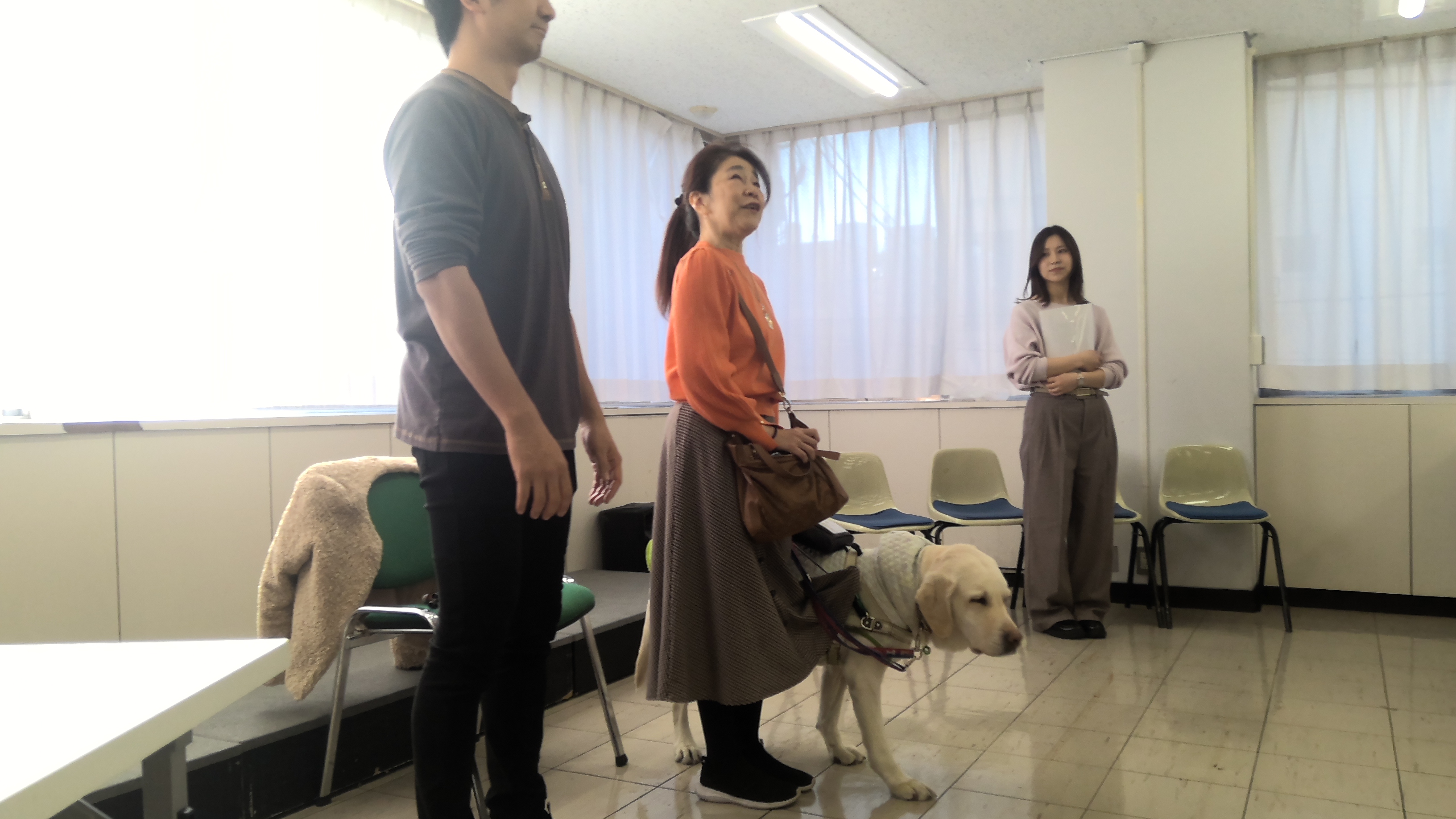 ↓講話の様子です。ドアノブの場所を教えてくれたり、車が来ることを察知して止まってくれたりする盲導犬、とても頼もしいですね。