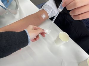 薬剤を塗布したパッチを肌に貼り、反応を確認することで、自分がアルコールに強い体質か、あるいは少量でも影響を受けやすい体質なのかを各自が確認しました。